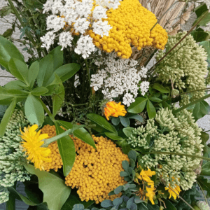 En fin d’automne et en hiver : fleurs séchées mêlées à du feuillage frais