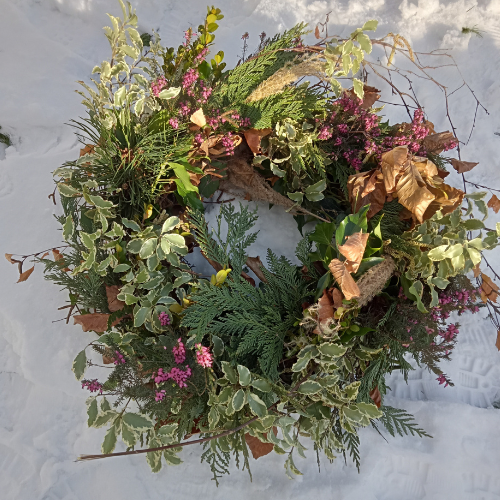 Couronne Deuil composée entièrement de feuillages locaux de saison.